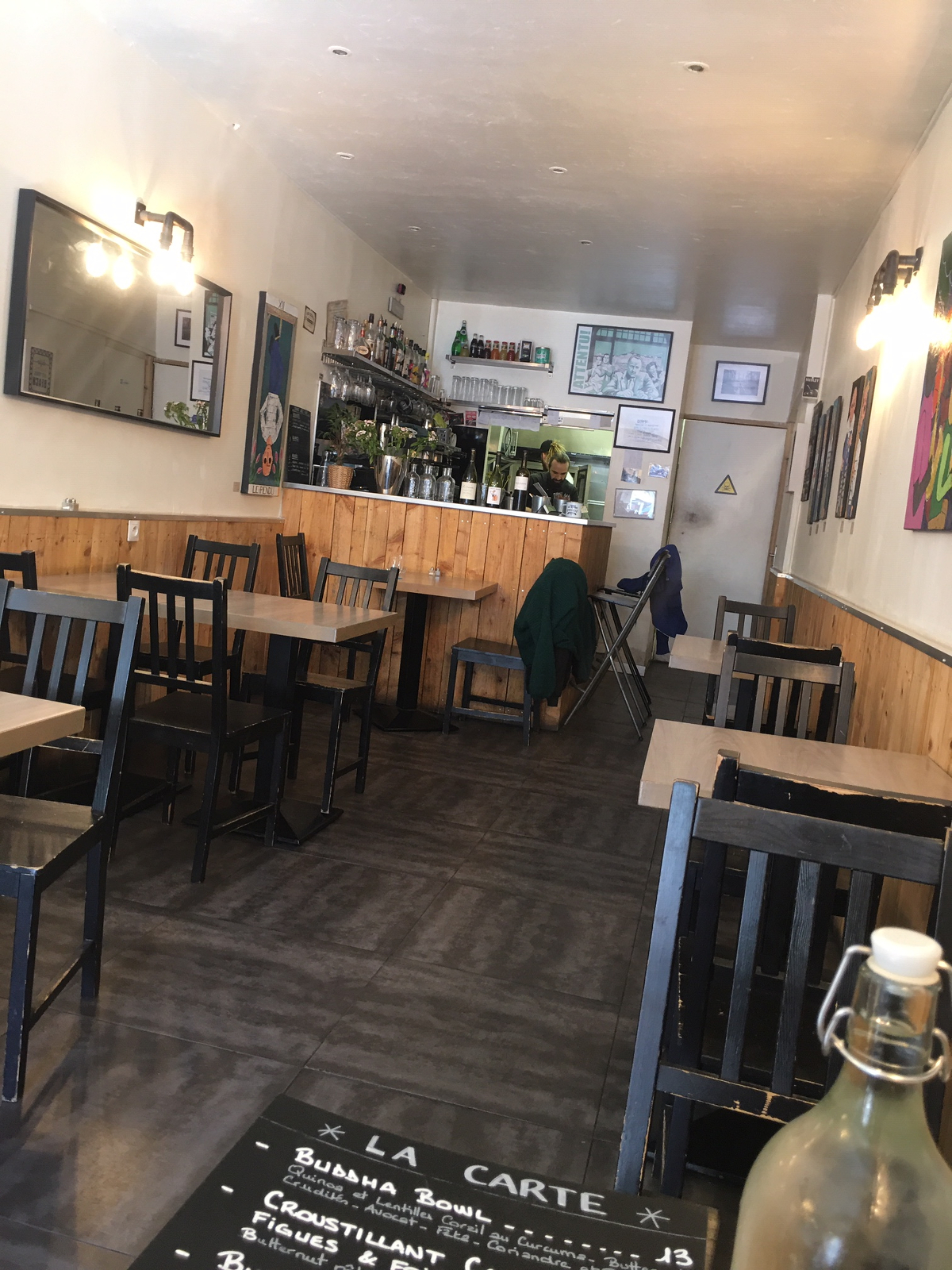 Ce qui résonne comme du redondant au cobaye qui recense les lieux communs est une belle réussite: coupe, qualité du poisson, cuisson du bestiau juste marqué. Légumes frais, carottes sucrées en deux couleurs et pois gourmands. Le riz japonais de type uruchimai, semble réchauffé! Fade. Argumenté par du sésame noir, peu intéressant, dommage il plombe le plat. Sauce soja sucrée. J’ai sorti mon 14,5/20 pour 15€ seulement. A ce prix, on te fourgue généralement de l’albacore sec et fibreux décongelé de frais. Bravo pour l’effort! Je n’ai rien pris d’autre, ce qui gonflera visiblement la patronne derrière son tiroir-caisse. Vu qu’on ne m’a pas donné la carte des boissons, pas envie d’y aller à tâtons. La serveuse joue juste, adorable dans la complémentarité. Une bonne idée de la place et autour car vraiment, j’en ai un peu ras le moutardier des taules qui se la joue cool Raoul et qui te fracassent ton 13èmemois même quand tu ne l’as pas.